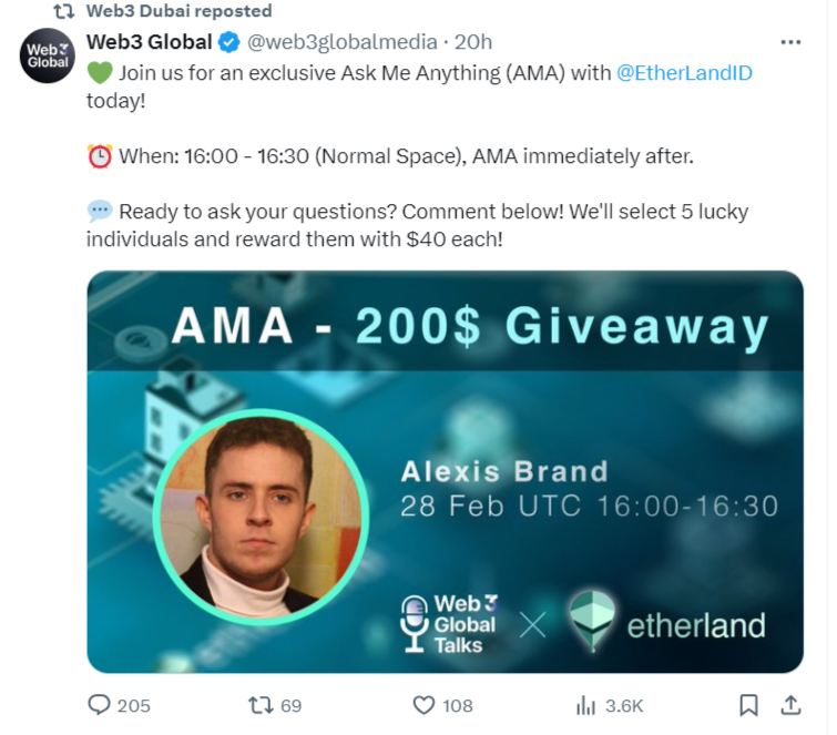 The build-up to Web3 Dubai has been marked by a series of high-profile AMAs on X, including the Web3 Global AMA with Etherland’s CEO, Alexis Brand, which attracted thousands of listeners from various crypto and finance communities. Gain exposure to Etherland’s future by participating in the Tecra Space fundraising campaign and joining the community on Telegram, Discord, and X.